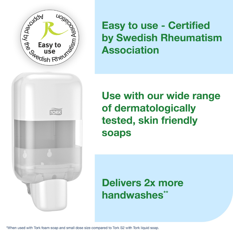 + Delivers 2x more handwashes (when used with Tork foam soap and small dose size, compared to Tork S2 with Tork liquid soap)