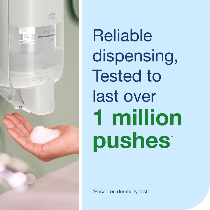 + Foam soaps help reduce soap consumption by up to 50% vs liquid soap (Essity test: Using Tork Foam Soap vs Tork Liquid Soap in an Elevation dispenser)