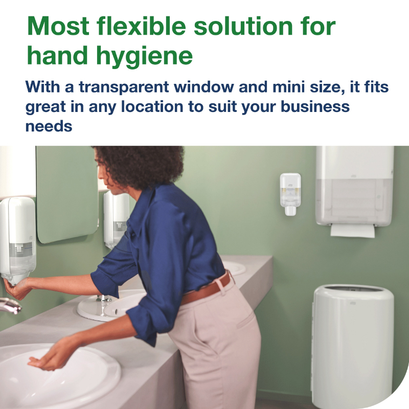Tork Mini Soap and Sanitiser Dispenser S5: The Tork Mini Soap and Sanitiser Dispenser fits any location. This dispenser can be used with a wide range of Tork soap, sanitiser, shower cream, seat cleaner and lotion refills in hygienically sealed bottles to suit your business needs. Its reliable dispensing, variable dose size and certified easy-to-use design promote good hand hygiene for all users. Make a lasting impression on your guests with the functional and modern design of our most versatile soap and hand sanitiser dispenser.